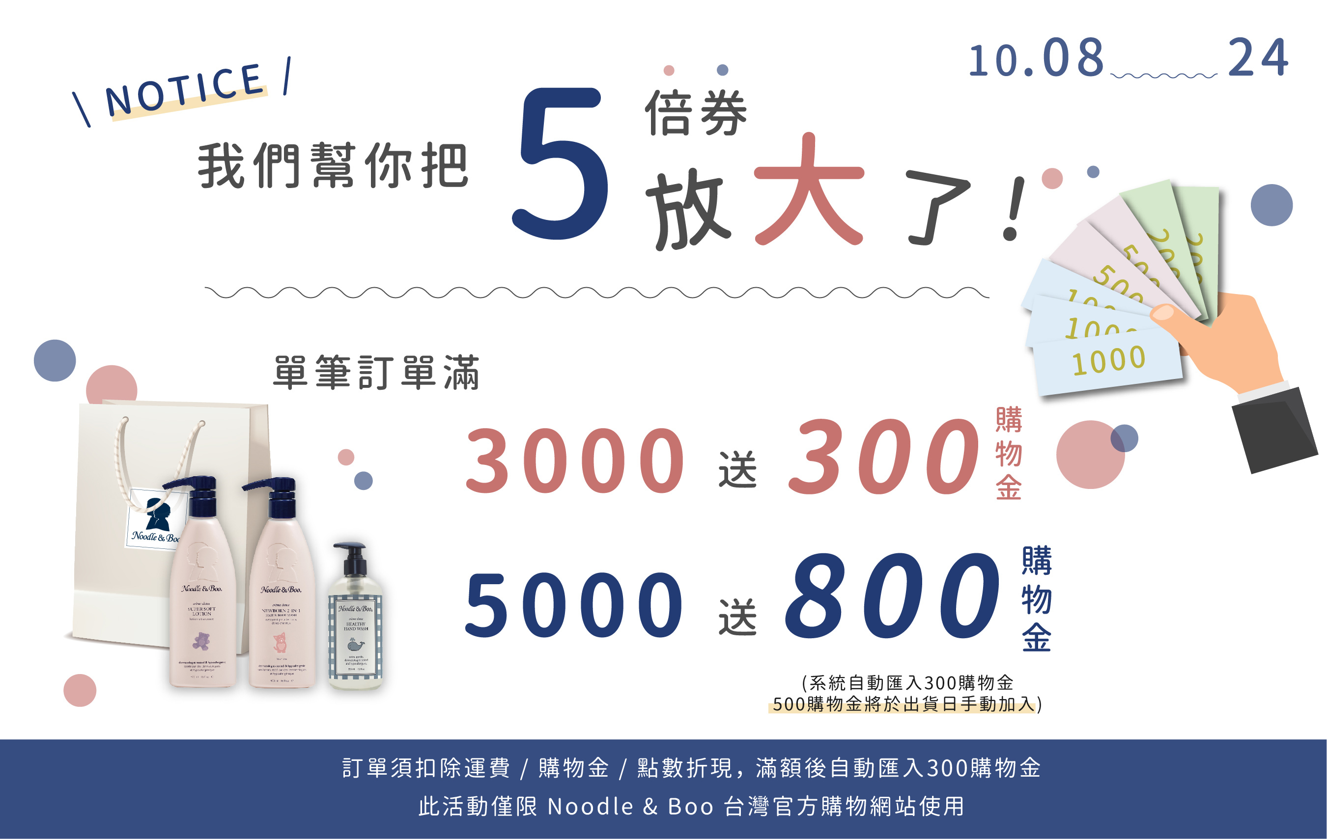 4. 購物金使用期限180天,僅限於Noodle & Boo 台灣官方購物網站使用。購物金詳細使用辦法請參閱 購物需知